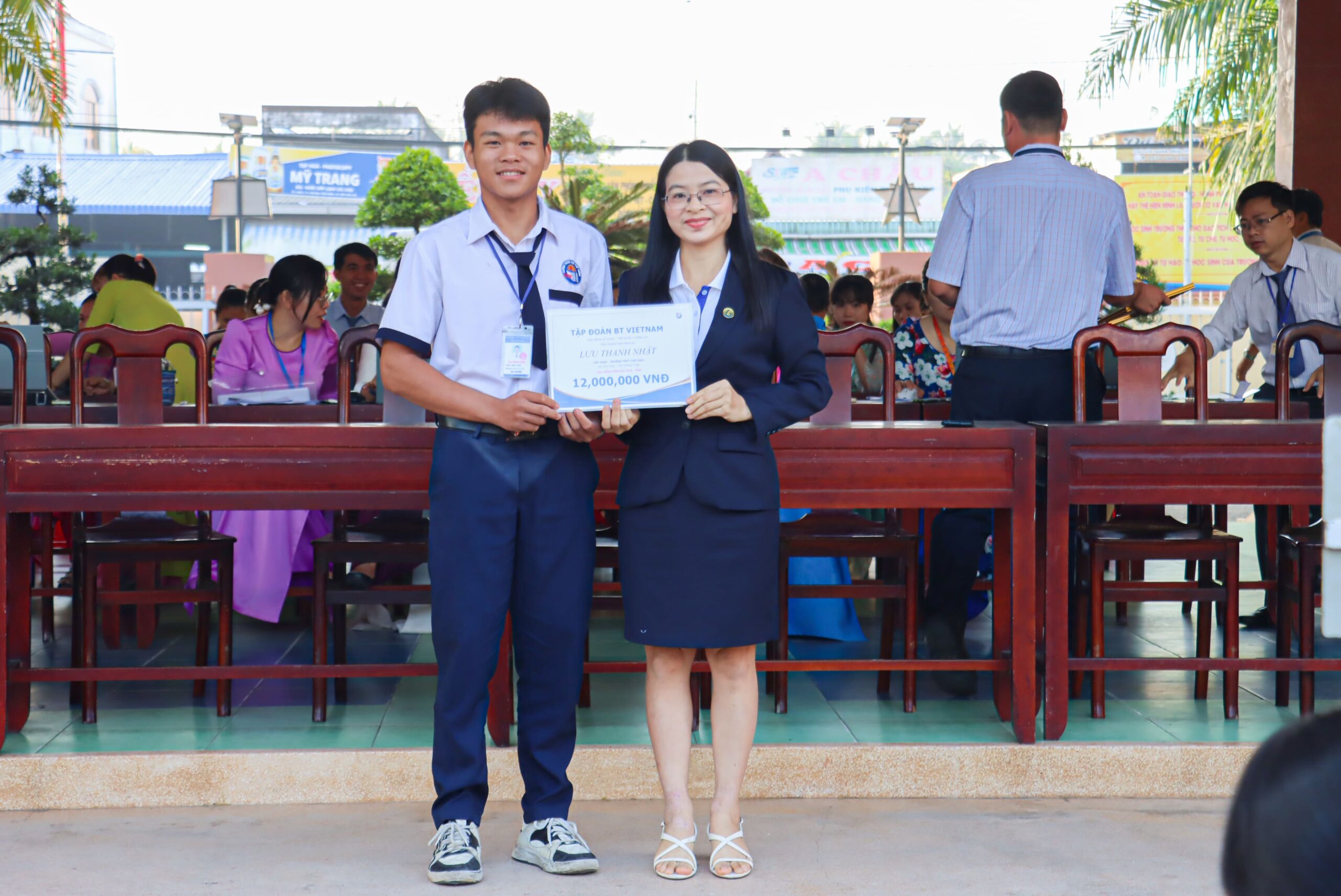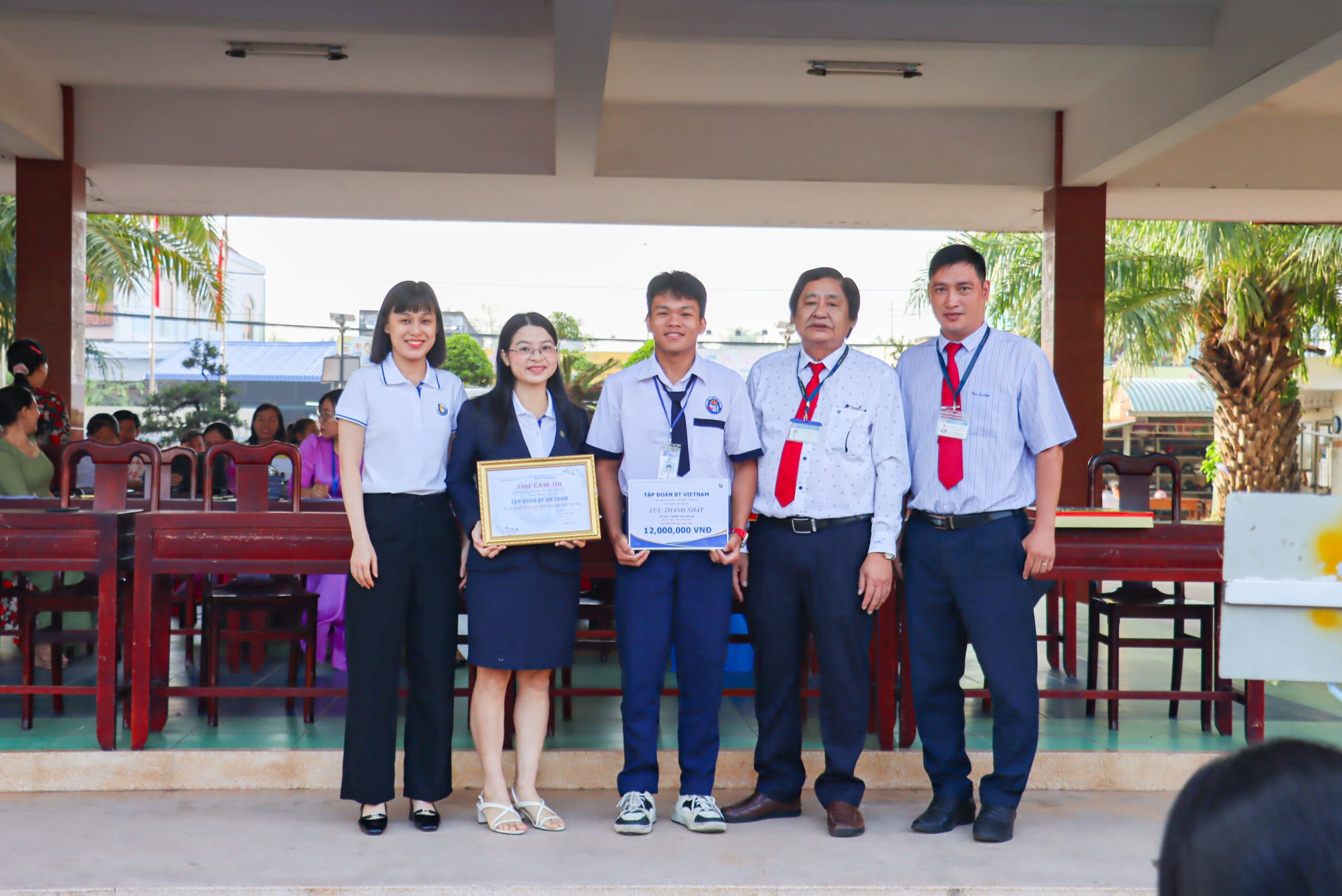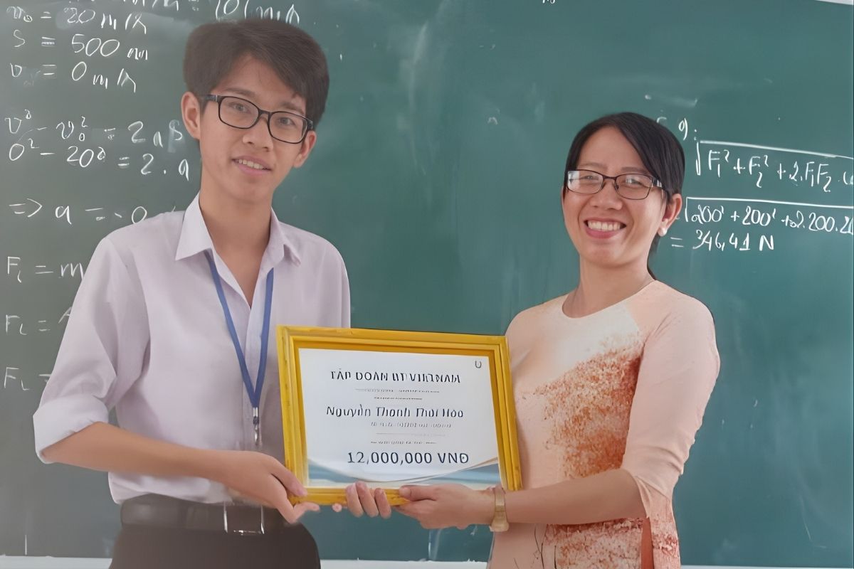Trao học bổng cho em Lưu Thanh Nhật, học sinh lớp 11KA2, Trường THPT Chợ Gạo, tỉnh Tiền Giang